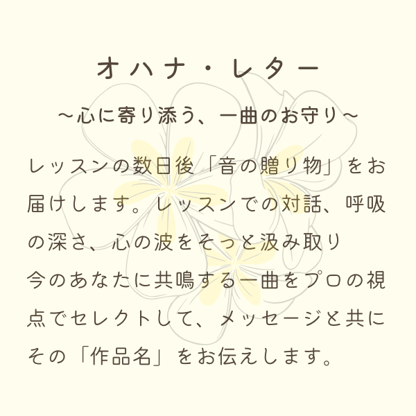 - 内容: まずは音の響きと、ハワイの風を感じてみたい方へ。
